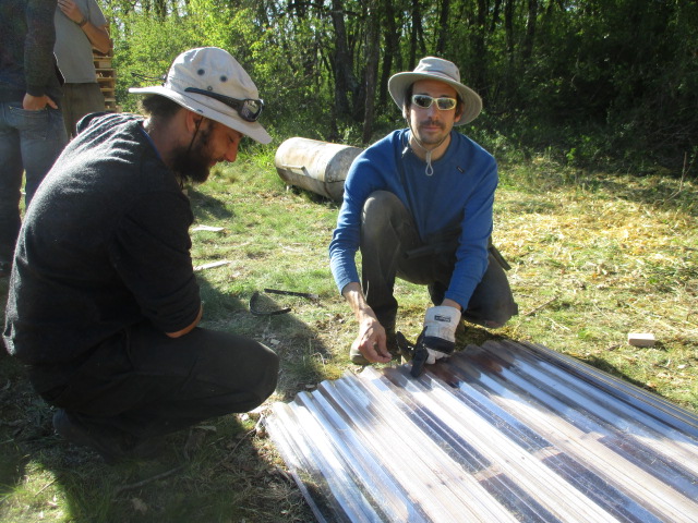 Le samedi, une équipe mixte de Lussauldiers et de personnes de Bul'de Mômes ont fini les douches et le plancher de la cuisine extérieure. L'alimentation électrique était fournie par les panneaux solaires de Florent, une belle cohérence avec notre projet qui veut illustrer l'harmonie sociale et environnementale.